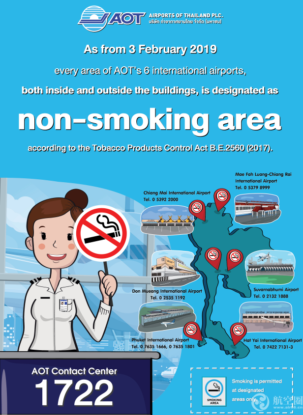 航空圈讯 泰国机场集团宣布2月3日起,泰国6个主要国际机场航站楼内的吸烟室全面停用,并已陆续拆除,也就是机场航站楼内全面禁烟,违者将处最高5000泰铢(约1080元人民币)罚款。