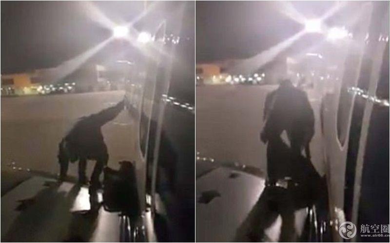 地面工作人员发现不对,赶紧对其喊话,要求他回到飞机上,这种私开安全门的行为不仅危险,而且还违法了。
