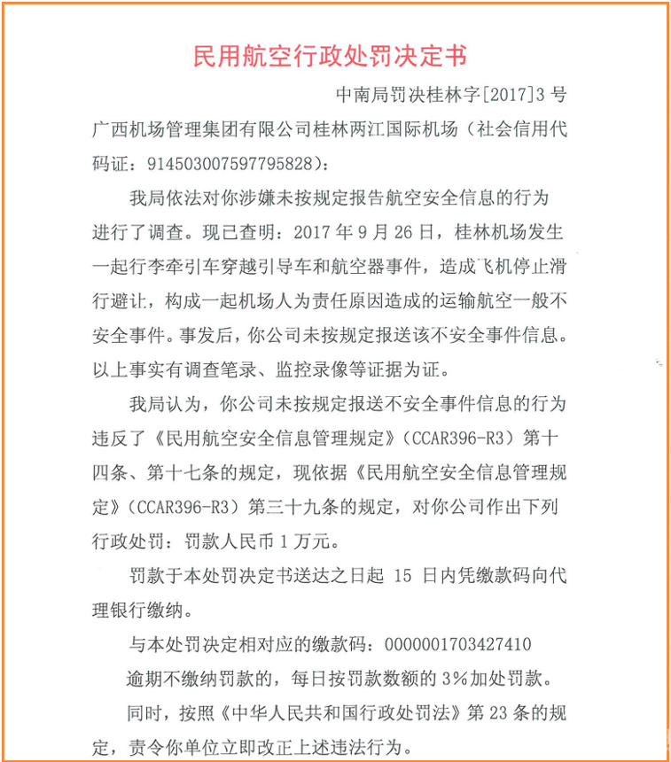民航中南局1月2日发布了一则行政处罚决定书,披露了此事。根据该处罚决定,2017年9月26日,桂林机场发生一起行李牵引车穿越引导车和航空器事件,造成飞机停止滑行避让,构成一起机场人为责任原因造成的运输航空一般不安全事件。