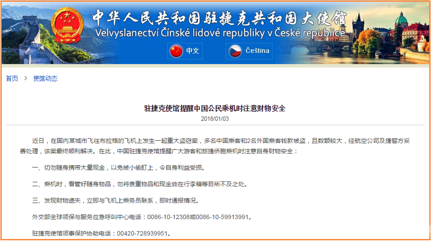 中国驻捷克使馆提醒广大游客和旅捷侨胞乘机时注意自身财物安全: