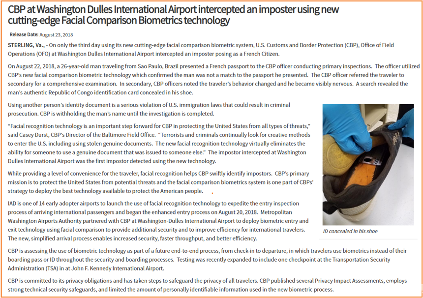 美国海关及边境保护局(CBP)在其官网发布消息指出,8月22日,华盛顿杜勒斯国际机场(Dulles International Airport)启用面部辨识新设备才第三天,就抓到来自巴西圣保罗的一名26岁男子,以假身份持用冒名的法国护照企图闯关。