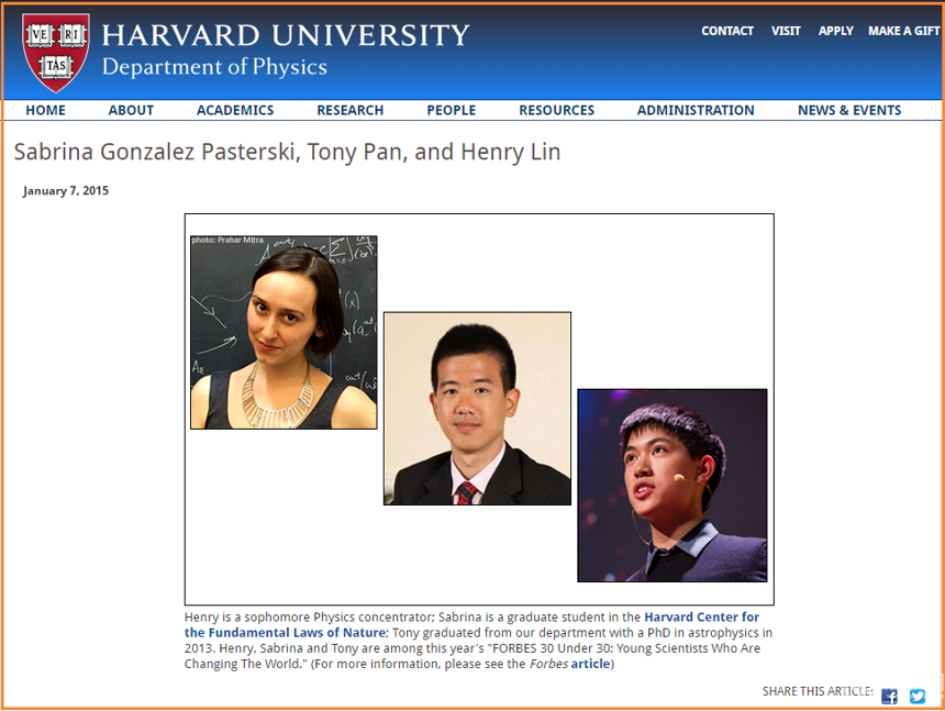 这名“90后”女生研究的都是常人无法理解的高深内容,关乎于我们如何理解这个宇宙。她的论文甚至被知名物理学家史蒂芬·霍金在2016年1月发布的一篇论文引用,被指导教授誉为“下一个爱因斯坦”。四年前,她从麻省理工大学物理系以GPA 5.0的满分毕业,也是该系二十年来首位以最高分毕业的女性,而且只花了三年。她并已获波音、蓝色起源(BlueOrigin,亚马逊创始人杰夫·贝索斯旗下太空公司)和美国国家宇航局NASA的工作邀约。