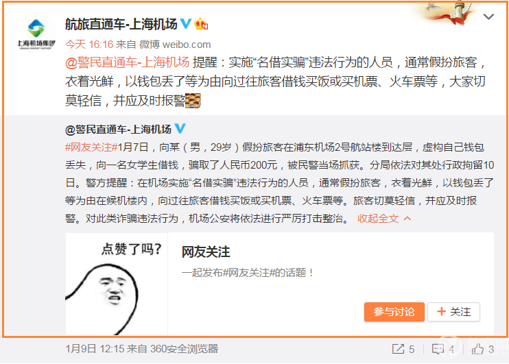 一名男子近日在上海浦东国际机场骗女生200元,被警方抓到,拘留10日。