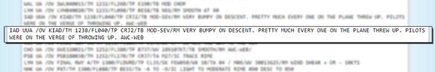 美联航旗下联合快运航空(United Express)编号3833短程航班,当地时间3月2日清晨6点半由维吉尼亚州夏洛茨维尔(Charlottesville)飞往华盛顿杜勒斯国际机场(Washington Dulles International Airport),降落之际遇上强气流。美国国家气象局航空气象中心接到一名飞行员报告,机上“差不多全部乘客有呕吐,连机长也差点儿呕”。