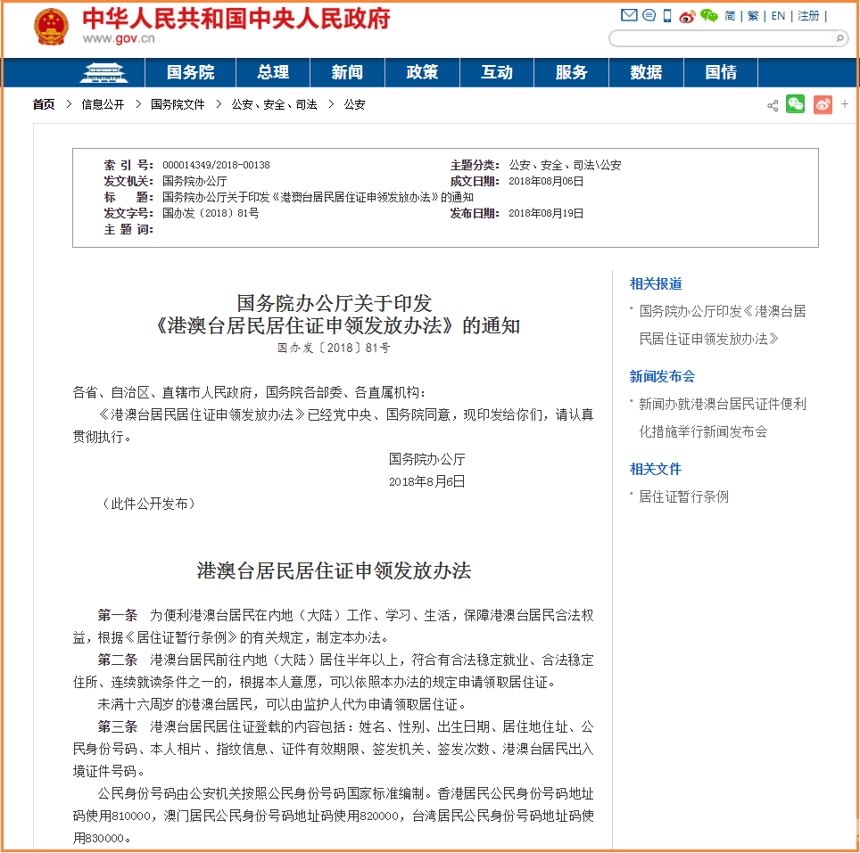 中央政府网8月19日公布了《港澳台居民居住证申领发放办法》,全文如下: