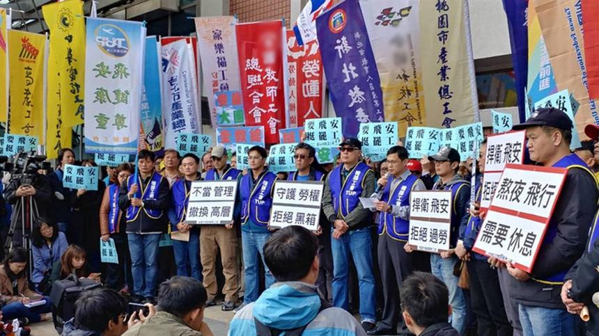 另外,2月11日当天,台湾超过60个各行业工会团体齐聚台北松山机场前,齐声呼喊“要飞安、挺罢工”等口号力挺机师罢工行动,同时表态反对订定罢工预告期。