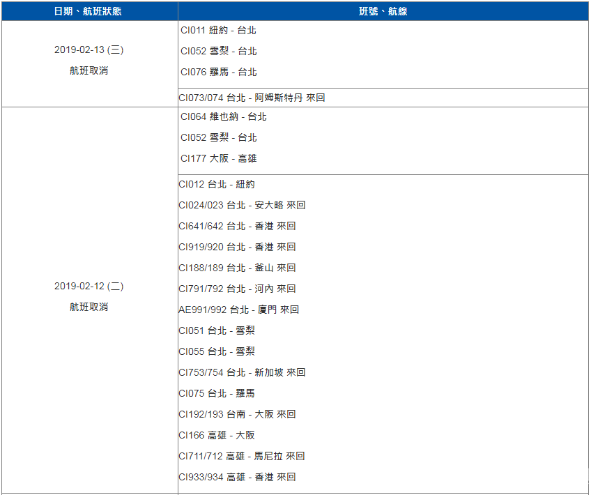 根据华航官网发布的信息,2月8日以来,华航已经取消了约110个航班(2月12日28班、2月13日5班),其中2月8日至11日总计取消84个航班,累计影响1.25万人次,多数签转其他公司,也有上千人滞留外地,公司发布重大讯息指出营收损失估计约1.05亿元台币,赔偿及其他影响金额尚在估算中。