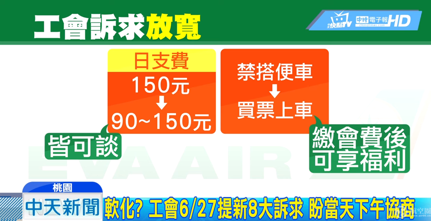 面对长荣的强硬和舆论的批评, 工会方面态度似乎软化。此前,工会一直坚持的“提高外站津贴”(日支费)、“禁搭便车条款”(非会员不得享受协商成果)等诉求,如今都有了弹性空间,不在坚持日支费从90元涨到150元,而是只要涨就可以谈,而“禁搭便车”可以改为“买票上车”(事后只要交会费成为会员即可)。