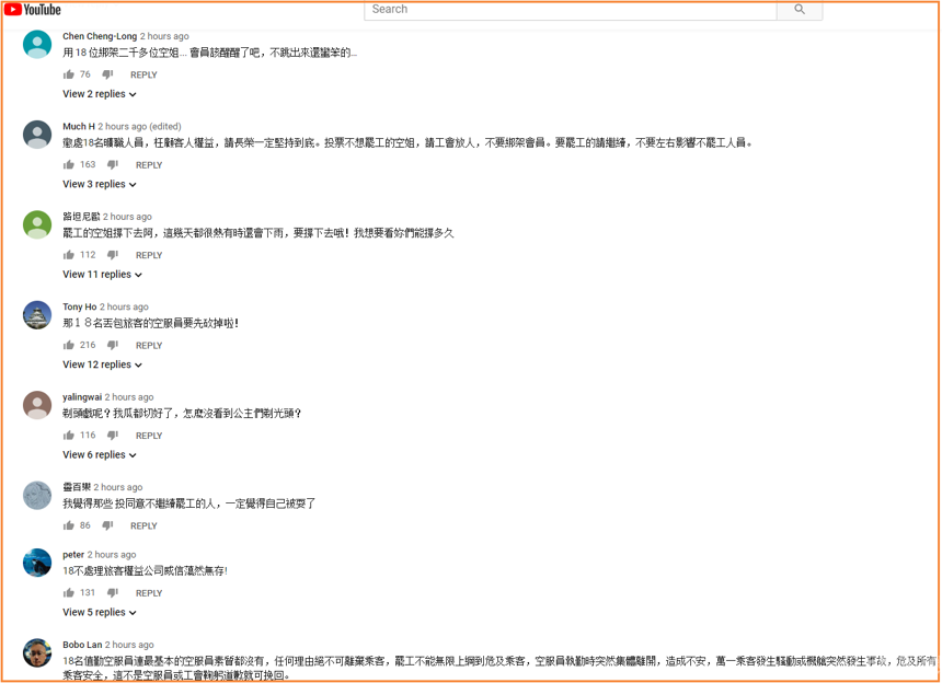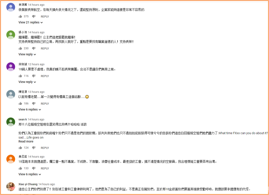 尽管工会表示18名空姐罢工合法,但是却引发网民和媒体的一面倒地批评,认为这些空姐当时的行为缺乏职业道德,支持长荣航空处罚,并表示如果不处罚18人,拒绝乘坐长荣航空,甚至有网民认为禁止她们从业。也有网友认为,工会用18个空姐“绑架”其他2000多名空姐,导致罢工继续。
