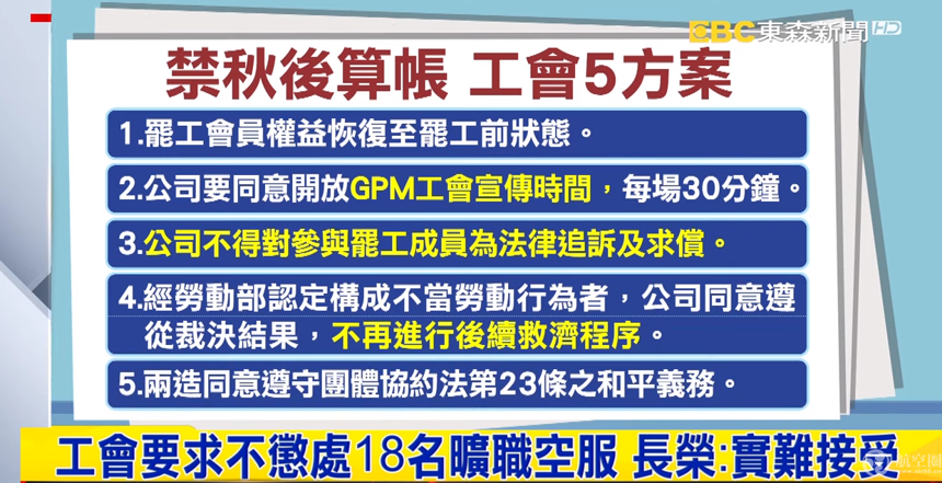 而桃园市空服员职业工会6月29日晚间发布的声明称,会员资格以及参与罢工有所疑义时,以工会认定为主;公司要公司不得对参与本次罢工之所有工会、工会会员、干部以及协助人员为法律追诉及求偿。也就是说,工会要求长荣不能对任何一名罢工空姐“秋后算账”。