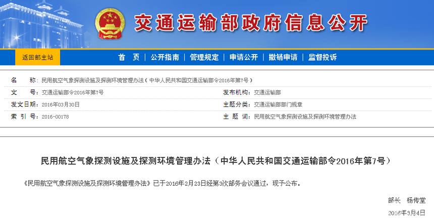 航空圈讯 交通运输部3月30日公布《民用航空气象探测设施及探测环境管理办法》(中华人民共和国交通运输部令2016年第7号),该办法自2016年4月4日起施行。