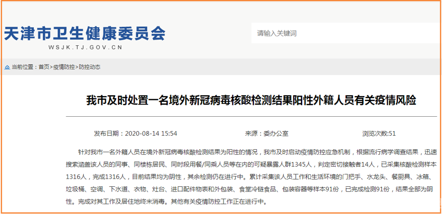 天津卫生健康委员会通报指出,针对天津市一名外籍人员在境外新冠病毒核酸检测结果为阳性的情况,天津市及时启动疫情防控应急机制,根据流行病学调查结果,迅速搜索涵盖该人员的同事、同楼栋居民、同时段用餐/同乘人员等在内的可疑暴露人群1345人,判定密切接触者14人,已采集核酸检测样本1316人,完成1316人,目前结果均为阴性,其余检测仍在进行中。累计采集该人员工作和生活环境的门把手、水龙头、餐厨具、冰箱、垃圾桶、空调、下水道、衣物、灶台、进口配件物表和外包装、食堂冷链食品、包装容器等样本91份,已完成检测91份,结果全部为阴性。完成对其工作及居住地终末消毒。其他有关疫情防控工作正在进行中。