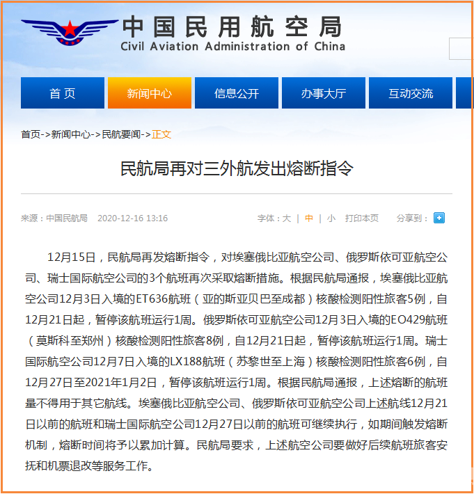 根据民航局通报,埃塞俄比亚航空公司12月3日入境的ET636航班(亚的斯亚贝巴至成都)核酸检测阳性旅客5例,自12月21日起,暂停该航班运行1周。俄罗斯依可亚航空公司12月3日入境的EO429航班(莫斯科至郑州)核酸检测阳性旅客8例,自12月21日起,暂停该航班运行1周。瑞士国际航空公司12月7日入境的LX188航班(苏黎世至上海)核酸检测阳性旅客6例,自12月27日至2021年1月2日,暂停该航班运行1周。