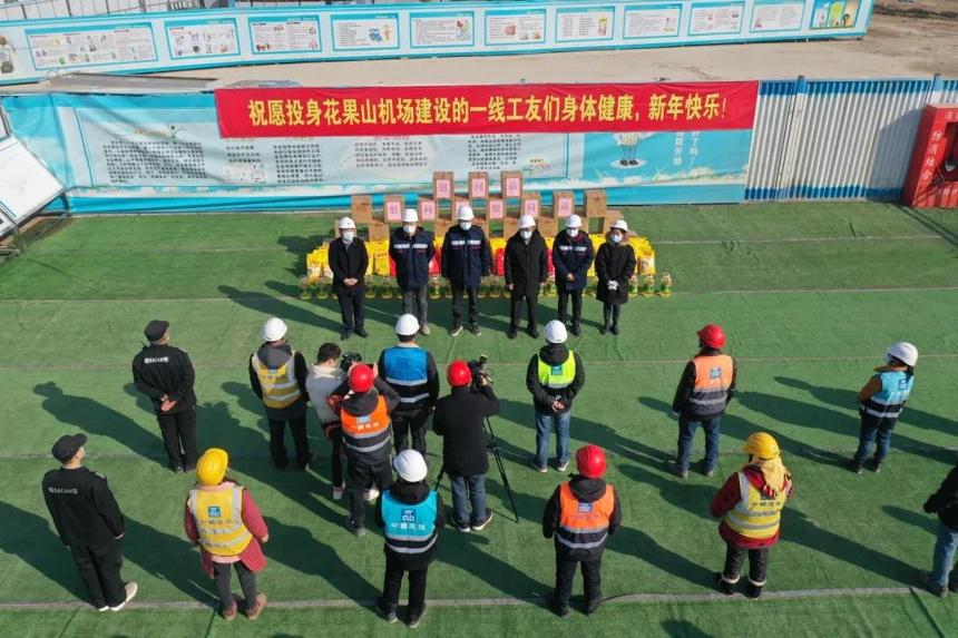 为保障机场建设顺利推进,响应政府春节期间就地过年的号召,花果山机场21家参建单位,500余名江苏省内外工程建设者,春节假期吃住在工地,就地过年。连云港机场通过发放“年货礼包”等方式稳岗留工,为投身花果山机场建设一线的工作者送上新春祝福。