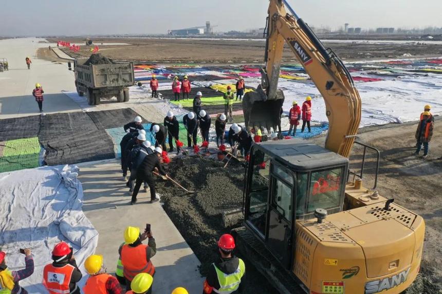 2月9日上午,随着最后一块道面混凝土浇筑完成,江苏省连云港花果山机场跑道道面全面贯通,至此,花果山机场飞行区跑道、滑行道混凝土道面工程全部完工。