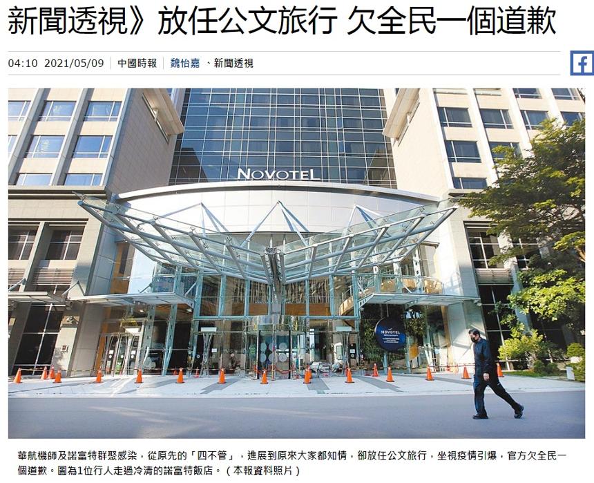 《中国时报》5月9日发布文章《放任公文旅行 欠全民一个道歉》称,在外界指责下,这两天来,“民航局”、“观光局”及桃园市政府大动作的裁处华航及诺富特饭店共241.6万元,只是罚了饭店及华航,“民航局”没管好机师、“观光局”没管好1馆、桃园市没管好防疫旅馆2馆,却都没事,而疫情指挥中心没做好督导,未协调积极补漏,却无人及制度可监督,迄今官方连一句道歉也没有,更难以服众。