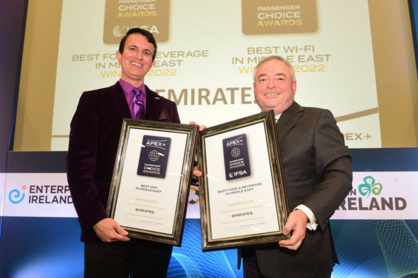 阿联酋航空近日在爱尔兰都柏林举行的2022年APEX区域乘客之选(APEX Regional Passenger Choice Awards®)颁奖典礼上,一举荣获中东地区“最佳机上Wi-Fi”和“最佳餐饮”两项大奖。