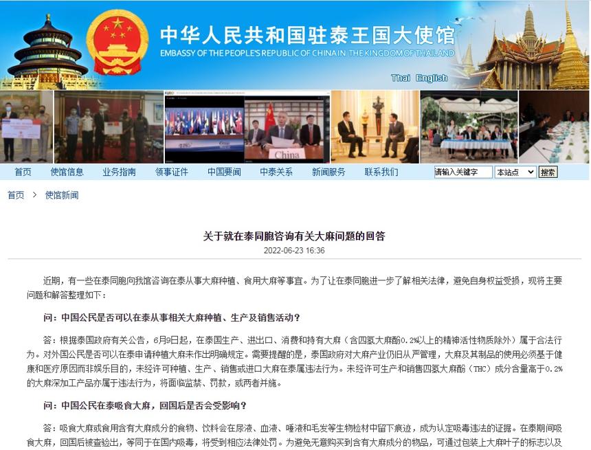 中国驻泰国大使馆关于就在泰同胞咨询有关大麻问题的回答