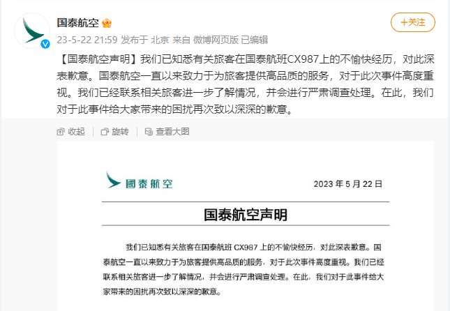 针对此事,5月22日晚间,国泰航空通过官方微博发布声明进行回应。