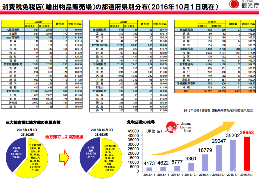 另外,日本国土交通省观光厅11月16日公布,截至10月1日面向访日游客的免税店达到38653家,比4月1日的35202家增加了约一成。