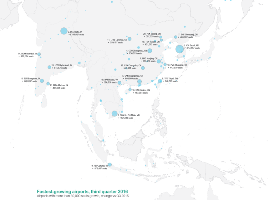 航空圈根据flight global在成都第22届世界航线发展大会上提供的信息,2016年第三季度郑州机场增加的航班座位数位居中国所有机场第一位,达到73.8万个,在亚太地区仅次于韩国仁川机场、印度德里机场、越南胡志明市新山一机场。