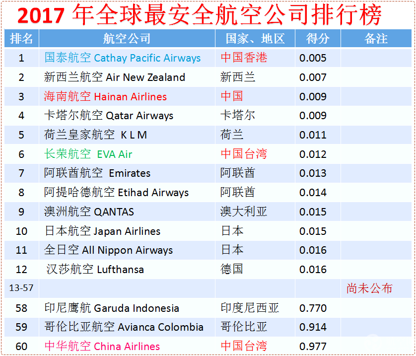 根据JACDEC已经发布的2017年安全榜单,排名前10位的航空公司分别是:国泰航空(中国香港)、新西兰航空(新西兰)、海南航空(中国内地)、卡塔尔航空(卡塔尔)、荷兰皇家航空(荷兰)、长荣航空(中国台湾)、阿联酋航空(阿联酋)、阿提哈德航空(阿联酋)、澳洲航空(澳大利亚)、日本航空(日本);第十一为全日空(日本)、第十二名为汉莎航空(德国);第58名为鹰航(印度尼西亚)、第59名为哥伦比亚航空,第60名为中华航空(中国台湾)。