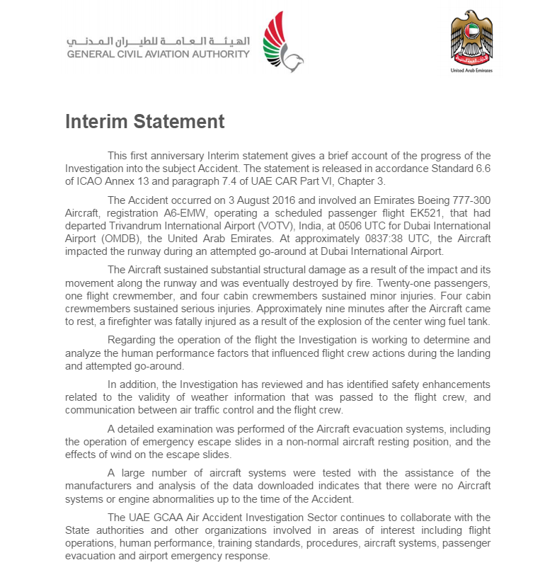 航空圈在阿联酋民航总局官方网站看到这份声明。阿联酋民航总局当天发表声明称:2016年8月3日,阿联酋航空公司注册号为A6EMW的波音777-300飞机,执行EK521航班从印度特里凡得琅国际机场( Trivandrum International Airport ,VOTV)到迪拜国际机场( Dubai International Airport ,OMDB),大约UTC08:37(世界标准时间)在迪拜机场试图复飞时坠毁。飞机结构遭到严重破坏并最终毁于大火。