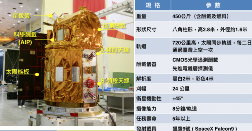 据台湾媒体2月24日报道,台湾“太空中心”规划的“福卫五号”,经过6年研发,从头到脚全部MIT(台湾制造),2017年8月25日用美国太空探索科技公司(SpaceX)的火箭猎鹰9号(Falcon 9)在美国加州范登堡空军基地正式发射升空。