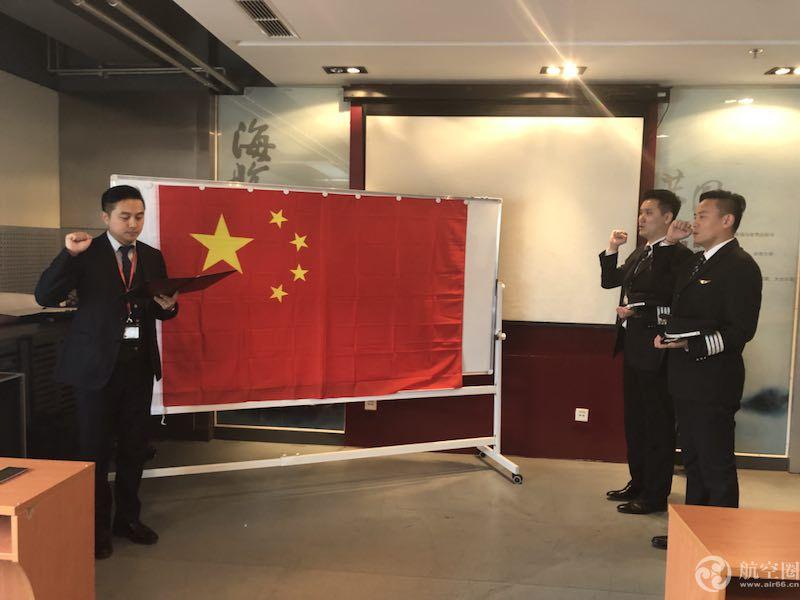 “我志愿投身北京首都航空有限公司飞行事业,坚持安全第一,刻苦钻研技术,严格执行飞行规章,坚决遵守飞行纪律,永远忠于机长职责,为北京首都航空有限公司争光……”首都航空的新机长王宁、李昊澄等人在程赛赛教员带领下面对国旗进行庄严宣誓。