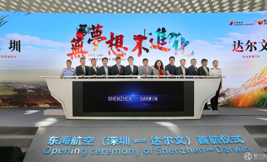 5月29日,东海航空举办主题为“无梦想,不进化”的首条洲际航线“深圳=达尔文”开航仪式,北京时间5月30日07:20,东海航空DZ6223成功抵达澳大利亚达尔文,标志着深圳=达尔文成功开航。