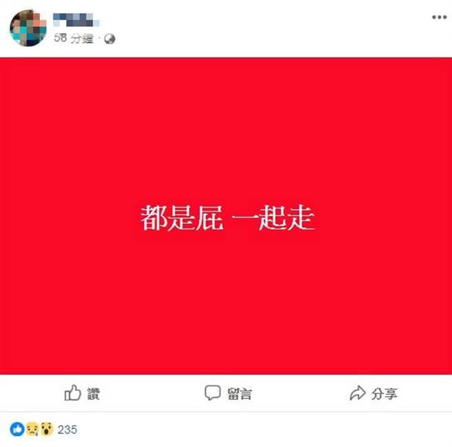 唐男6月29日下午在社交媒体写道“都是屁,一起走”,显见他依然相当愤怒,不能原谅妻子的背叛行为。 网友纷纷安慰他,要他坚强面对。“加油!保护好孩子!”“把影片公布出来,让她知道什么叫后悔”、“请按照律师的指示走,影片别轻举妄动,冲动你就输了”。