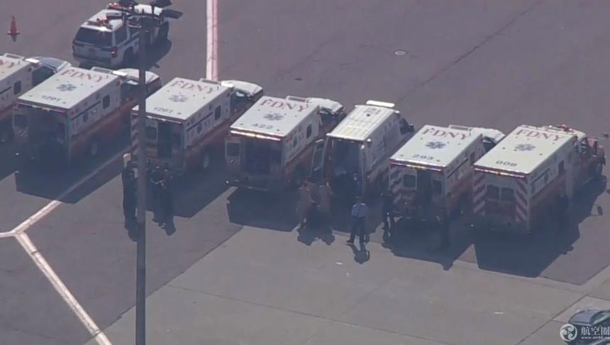 客机降落肯尼迪机场后,约有7辆救护车和几十辆警车、消防车等其他车辆在停机坪等待该空客A380客机抵达,美国疾病控制中心人员对乘客和飞机进行检查。