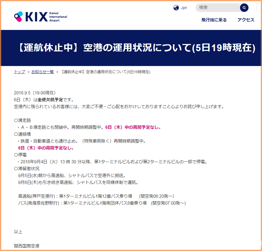 大阪关西国际机场9月4日因今年第21号台风而遭受严重损失,机场跑道及停机坪等设施被淹没,下午3点开始关闭,机场与陆地相连的唯一桥梁也受损无法通过,机场由此成为“孤岛”,5000名旅客陷入孤立状态。