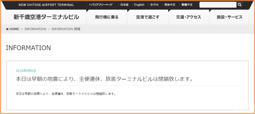 航空圈登陆新千岁机场官网发现,机场发布公告,称因为地震所有航班停运,机场航站楼关闭。但机场未说明何时恢复运营。