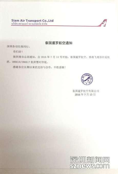 记者从深圳市旅游协会了解到, 7月12日泰国暹罗航空首先给广州合作的旅行社发通知,宣布从16日起,广州飞曼谷的往返4个航班停航。随后13日,向深圳相关合作旅行社发通知,宣布从14日起,香港飞曼谷的往返2个航班停航。