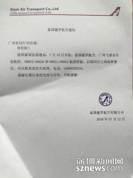 深圳新闻网7月14日(记者 余俐洁)7月13日,深圳各旅行社突然收到泰国暹罗航空自2016年7月14日开始停飞通知,至使833名旅客滞留泰国。这是今年继泰国都市航空停飞后,飞泰国境内第二个无故停飞的航班。
