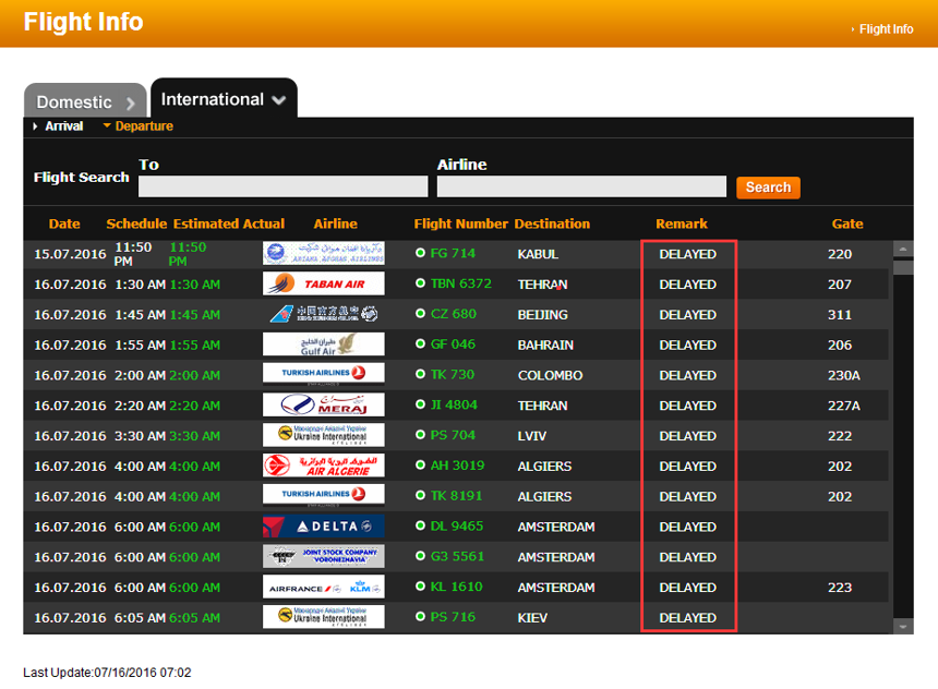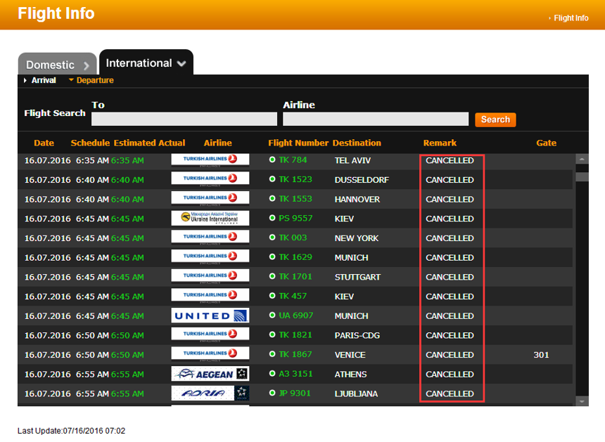 当地媒体报道伊斯坦布尔机场已经恢复正常。航空圈中午登录该机场官方网站查询,发现机场发布的国际航班信息基本都是“延误”(DELAYED)和“取消”(CANCELLED),中国南方航空从伊斯坦布尔飞往北京的CZ680航班显示为延误。而其国内航班多为取消。政变对机场的影响可能还要持续。