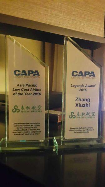 11月15日,在新加坡举办的2016 CAPA航空峰会中,春秋航空被授予2016年度亚太地区最佳低成本航空公司殊荣。