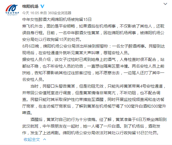 四川绵阳南郊 机场8月8日发布消息,日前,一名中年醉酒女性黄某,因在绵阳机场闹事,被绵阳机场公安分局处以行政拘留15天的处罚。