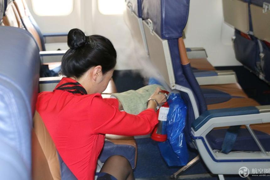 乘务员正在处理座椅背后冒烟起火的锂电池